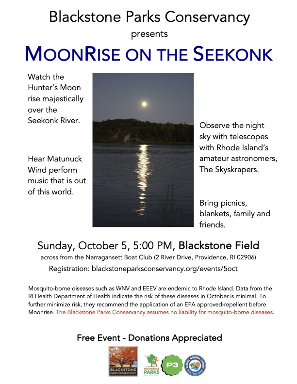 Mosquito-borne diseases such as WNV and EEEV are endemic to Rhode Island. Data from the RI Health Department of Health indicate the risk of these diseases in October is minimal. To further minimize risk, they recommend the application of an EPA approved-repellent before MoonRise. The Blackstone Parks Conservancy assumes no liability for mosquito-borne diseases.