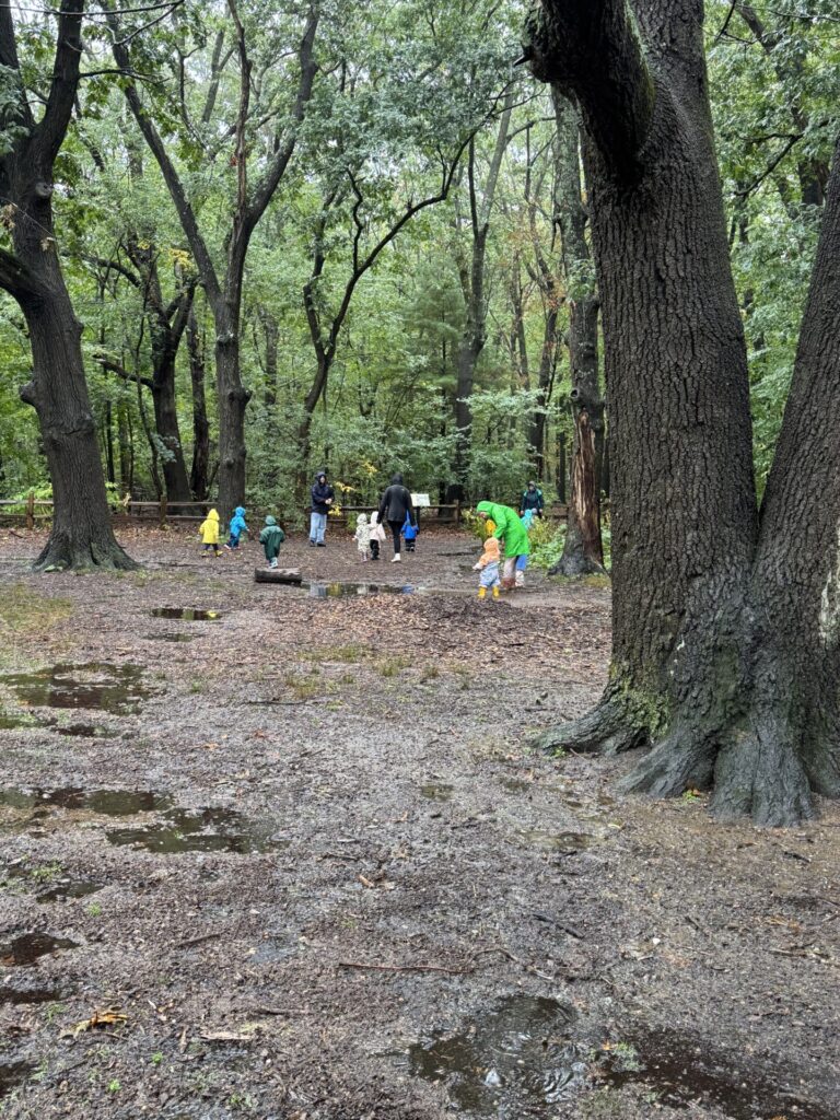 Some of Blackstone Park’s youngest walkers joyfully explored puddles and wet tree bark on a rainy morning.