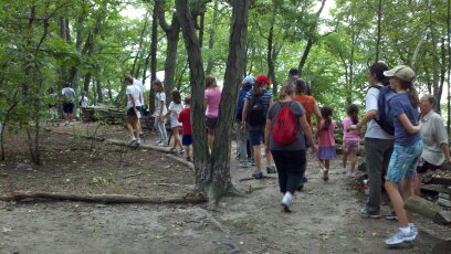 The volunteer guides pointed to bittersweet vines winding around trees and slowly squeezing them. Bright orange Jewelweed by York Pond intrigued the children, who balanced on the logs lining the trails.