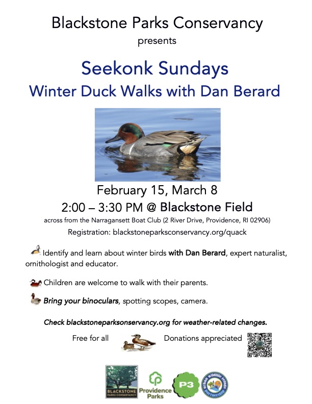 Dan will return to Blackstone Park and the Seekonk for more Duck Walks on February 15 and March 8. Registration strongly recommended. Dan Berard is an expert naturalist, ornithologist and educator. Children are welcome to walk with their parents. Bring your binoculars, spotting scopes, camera.