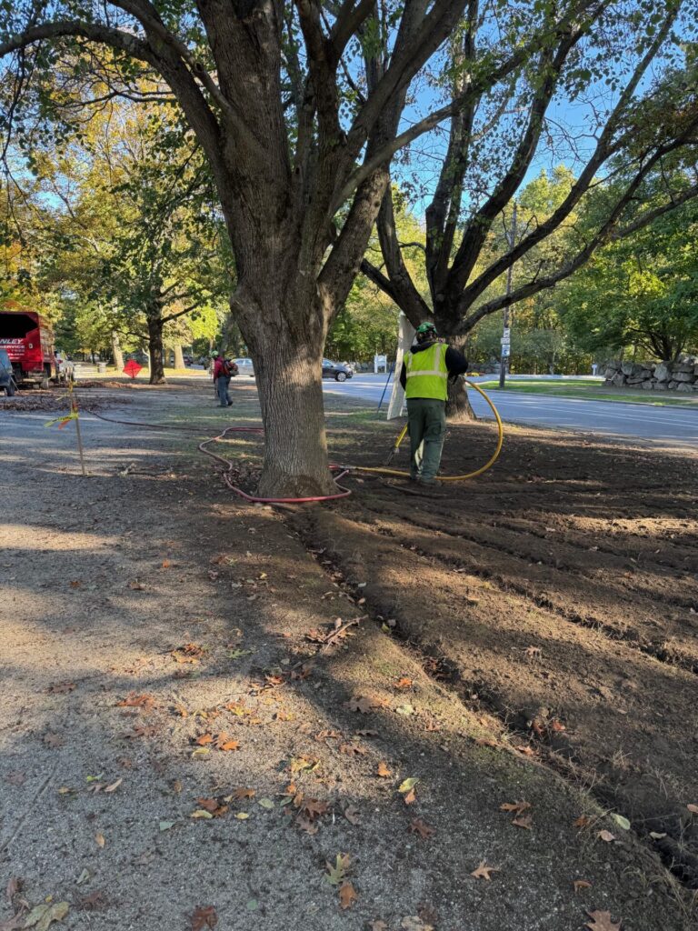 Renewal has begun! Thanks to good weather, contractors are air-spading today on the Boulevard near the Butler campus. This de-compaction, recommended by the City Forester, will let air, water and nutrients reach the roots of the mature trees that define the site.